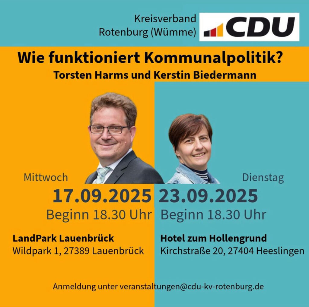 Sie interessieren sich für Kommunalpolitik? Sie möchten die Zukunft mitgestalten ? Dann kommen Sie am 23.September 2025 in das Hotel-Restaurant „Hollengrund“ Heeslingen und freuen sich auf eine interessante Infoveranstaltung.